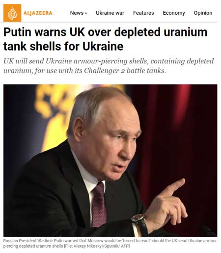 Putin advierte al Reino Unido que el envío de proyectiles de uranio empobrecido a Ucrania, podría desencadenar una respuesta nuclear.